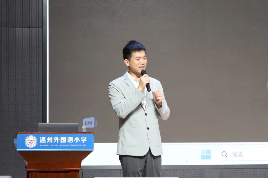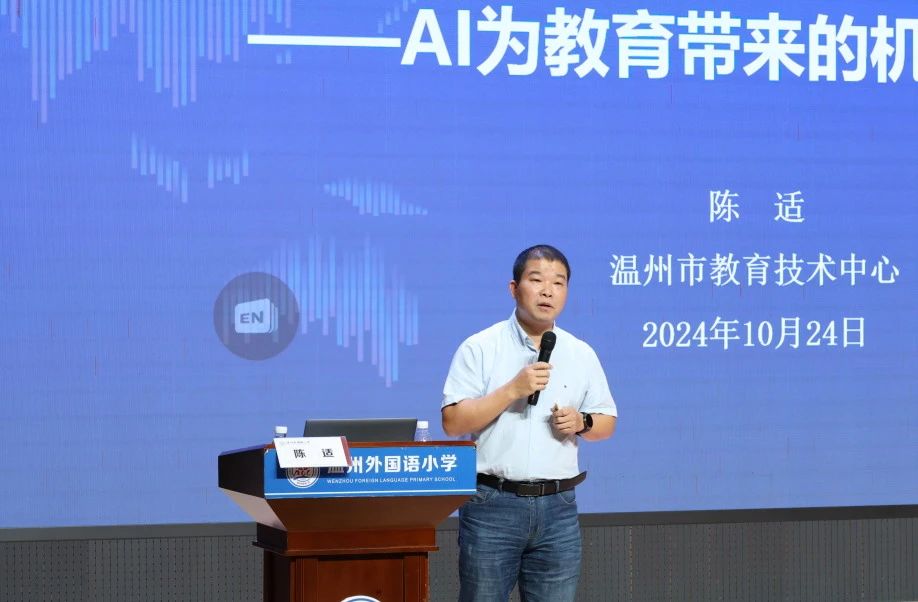 最后,国家中小学智慧教育平台应用省级专家、温州市教育技术中心陈适副主任为大家做专题讲座《人工智能教育应用的实践与思考--AI为教育带来的机遇与挑战》。在国家战略的引领下,教育数字化行动稳步推进,温州正积极开展智慧教育示范区建设。秉持“应用为王”的理念,构建丰富多样的应用场景,为教育的创新发展注入强大动力。陈主任的专业引领,让我们更加清晰地看到在 AI 时代教育的发展方向和广阔前景,激励着我们积极投身于教育数字化的实践中。