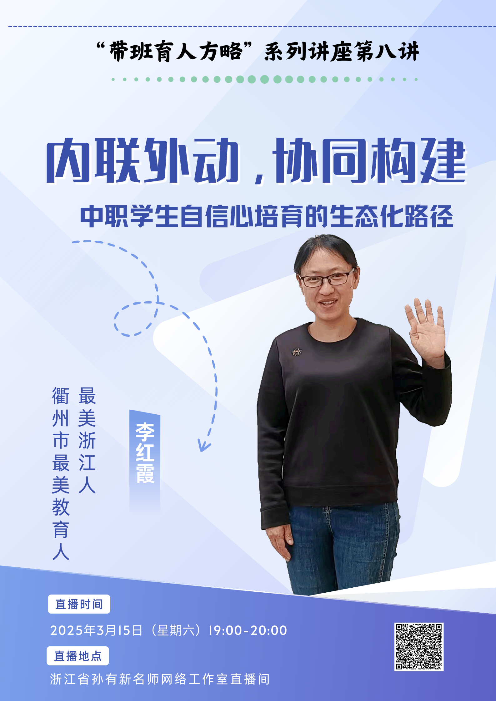 2025年3月15日晚,2023级温州市孙有新“名师送教”工作室联合文成县珊溪中学、浙江省孙有新名师网络工作室、瑞安市钱文辉名班主任工作室、瑞安市安阳实验中学钱文辉名班主任工作室、龙泉市练芬玲德育名师工作室、龙泉市小学班主任工作室、龙泉市刘海芬德育名师工作室、新昌县王剑平名班主任工作室、松阳县高中德育工作室、温州市魏丽红名班主任工作室、温州市教育先锋党员郭海群名班主任工作室、乐清市赵爱萍名班主任工作室,在之江汇直播间开展第23次研修活动。本次活动浙江省孙有新名师网络工作室学科带头人李红霞老师主讲,她是衢州市最美教育人,衢州市中小学优秀班主任,江山市百优班主任,江山市学科带头人,讲座的主题为《内联外动,协同构建——中职学生自信心培育的生态化路径》。这也是浙江省孙有新名师网络工作室“带班育人”系列讲座的第八讲。