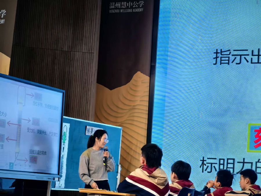 随后,永嘉的邱慧莹老师带领 401 班的同学们走进《弹簧测力计》的世界。邱老师遵循学生的认知规律,从让学生认识弹簧测力计的结构入手,逐步引导学生掌握正确的读数方法,最后指导学生正确使用工具进行测量。在学生经历完整的工具使用体验后,邱老师又抛出新的任务 —— 自制一个弹力更大的测力计,挑战学生的创新思维。更具匠心的是,邱老师还提供了损坏的弹簧测力计,让学生分组研究维修方案,并将其延伸到课后作业中,既培养了学生的实践能力,又让课堂知识与生活实际紧密结合。